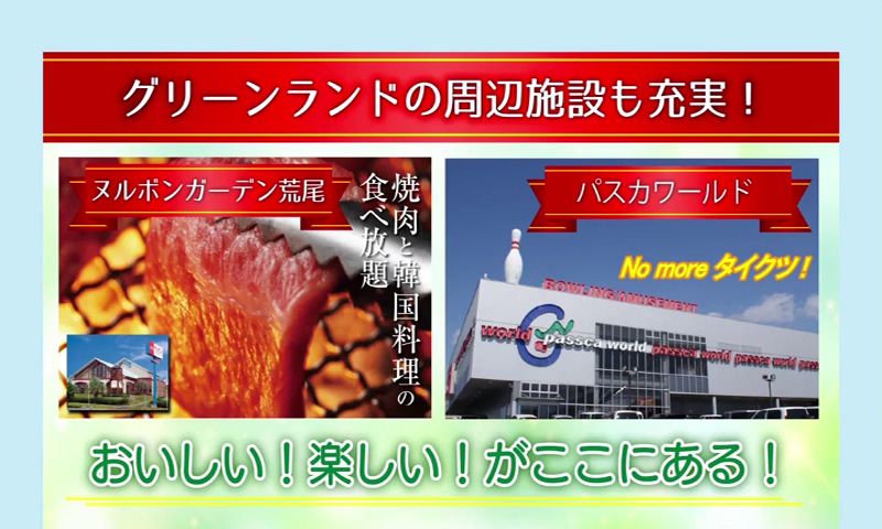 周辺には「ゴルフコース」「焼肉ヌルボンガーデン荒尾」、さらにアミューズメント施設「パスカワールド」も。家族みんなで楽しめます。
