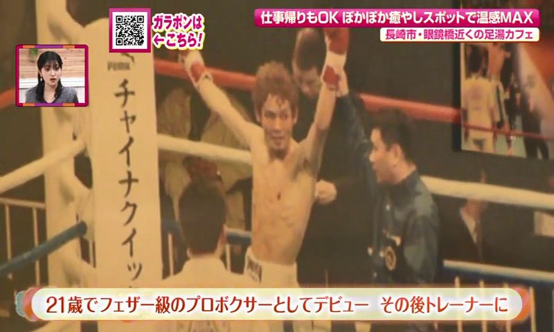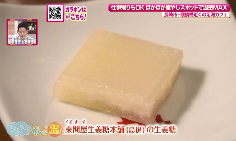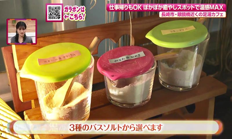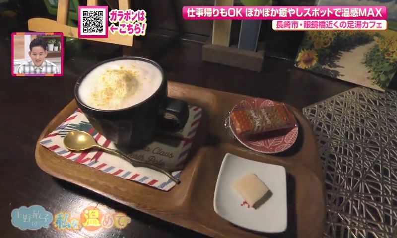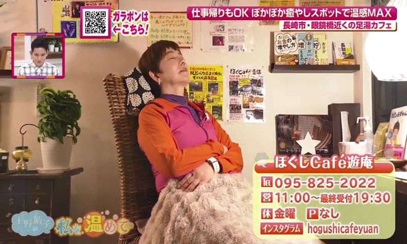 足湯に入りながらcafeを楽しめるメニューです。 大石さんは、21歳でフェザー級のプロボクサーとしてデビュー、そしてトレーナーとして活動した後、経験を活かし、地元長崎のみなさんを癒しています。 体をほぐすメニューはいろいろありますが、足湯カフェだけでも利用OKです。3種のバスソルトの中から、上野さんは「みかんとひのき」を選びました。 足湯専用のバケツに足を入れます。お湯の温度は43℃。外を歩き、凍えた足がほぐれていきます。 お風呂につかっているようです。冷えとかむくみの改善のほか、よい睡眠にも効果が期待できます。 ドリンクは4種類から選べます。上野さんはジンジャーミルクを選びました。 添えられているのは、島根の「來間屋生姜糖本舗(くるまやしょうがとうほんぽ)」の生姜糖。ミルクに使われているのは、これも島根のブランド生姜「出西生姜(しゅっさい・しょうが)」です。 「選べる足湯・選べるドリンク 出雲の生姜糖&お菓子付き」(1,200円) ショウガの効果で、上野さんの“温感メーター”は、Maxに。 玄米酵素の温湿布まくらをあてると眠りの世界に... 1時間までゆっくり過ごせます。 ほぐしcafe遊庵