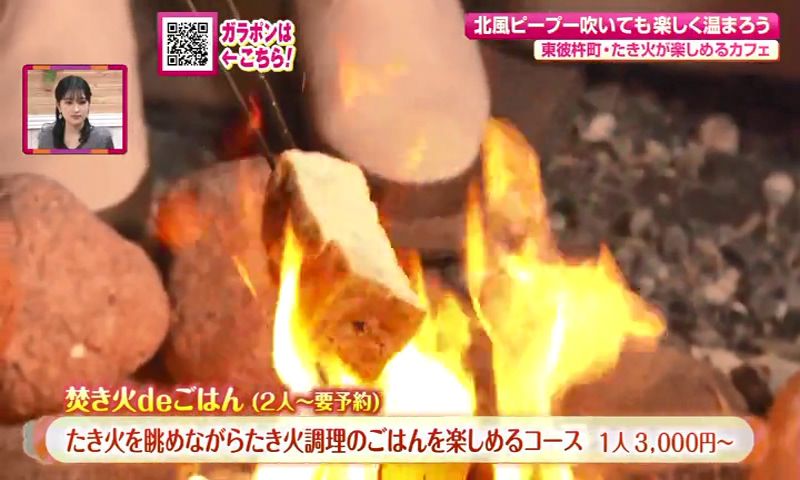 焚き火を眺めながら焚き火調理の食事を楽しめる「焚き火deごはん」コース(2人~ 要予約)は、1人3,000円~です。