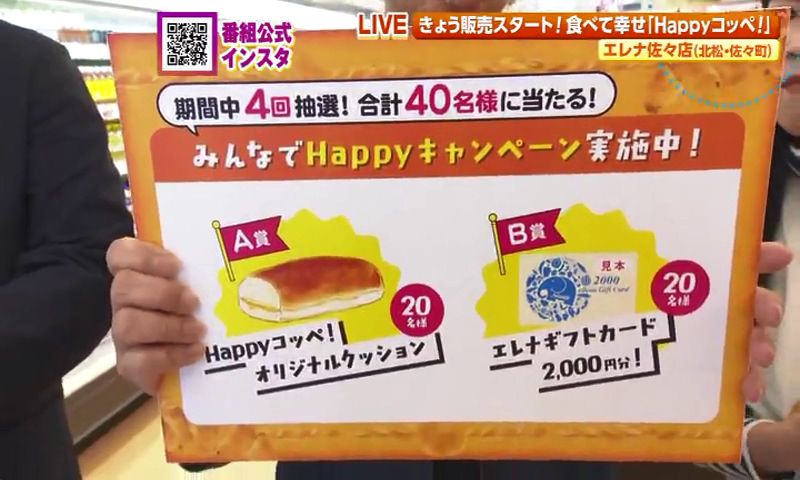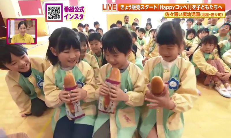 記念すべき発売日、サッキーがいつも以上に気合いを入れて、 トコトン素材にこだわり... 試作と試食を繰り返し... 太陽の光をたっぷり浴びて育った五島の安納芋も自ら収穫体験!🍠 そうやって完成したHappyコッペ!の中には甘~い安納芋フィリングがたっぷり♡ オーブントースターで2分ほど焼いて食べると、 Happyコッペ!はエレナ全店で期間限定発売中🍞サッキーの笑顔が目印です♡ オリジナルクッションやエレナのギフトカードが抽選で当たる ” かわいい子どもたちに、できたてほやほやのHappyコッペ!をプレゼント🍞✨ 「ふわふわ♡」「おいしい♡」 佐々青い実幼児園のみなさん、ありがとうございました!✨