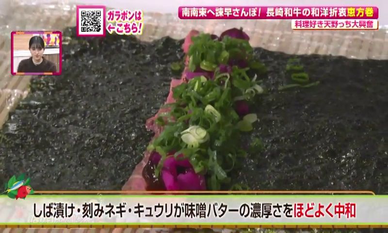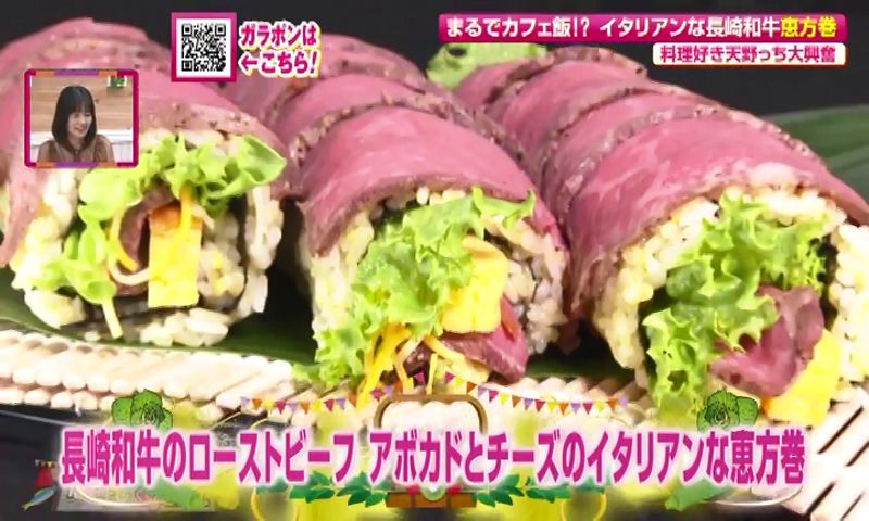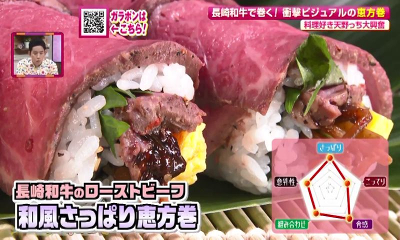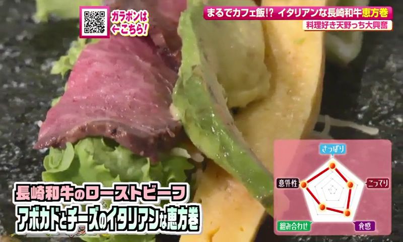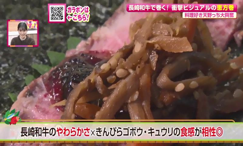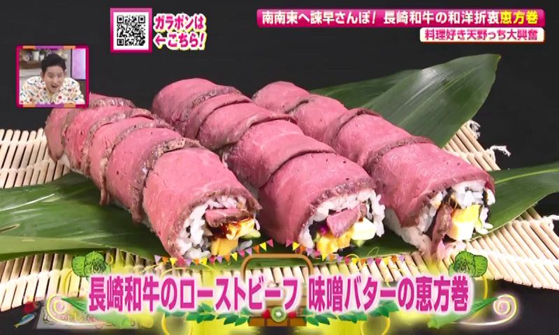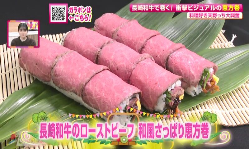 「長崎和牛のやわらかさ×きんぴらゴボウ・キュウリの食感の相性◎」の≪長崎和牛のローストビーフ 和風さっぱり恵方巻≫ しば漬・刻みネギ・キュウリが味噌バターの濃厚さをほどよく中和してくれる≪長崎和牛のローストビーフ 味噌バターの恵方巻≫ チーズ・フライドオニオン・黒コショウ・アボカドが入って、クリーミー&スパイシーさを両立させた≪長崎和牛のローストビーフ アボカドとチーズのイタリアンな恵方巻≫ 3種類の恵方巻を食べた芸能界屈指の料理好き天野っちの感想は... 「巻くにふさわしい、いい脂加減、さし加減の牛だと思いました。中身と合わせるとお肉の良さも引き立って、いいバランスのアイデアもいっぱいありましたね」 天野っちの感想も参考に、3つの中から選ばれたのは、「長崎和牛のローストビーフ 和風さっぱり恵方巻」。エレナの店舗で2月3日に600本限定で発売しました。