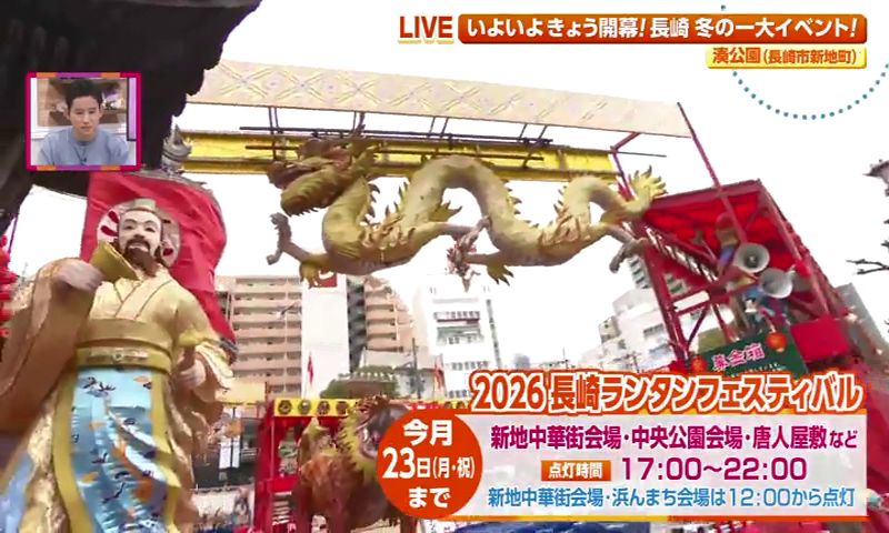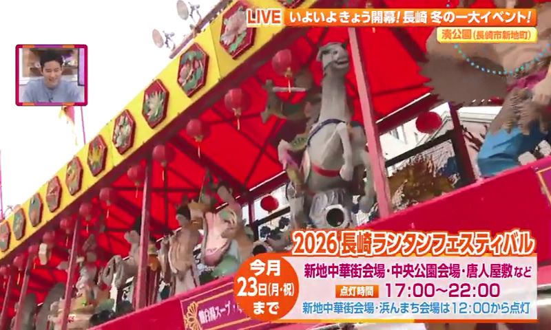 2026長崎ランタンフェスティバル がいよいよ開幕!中継では一足先に、あゆちゃんとイマンくんがランタンに彩られた湊公園におじゃましました✨ ランタンフェスティバルの目玉といえば今年新調されたメインオブジェ「龍馬精神(ロンマー・ジンシェン)」。 龍と、今年の干支の「午」がモチーフになっているそうです。高さはなんと11m!大迫力をぜひ湊公園会場で体感してみてくださいね。 大型オブジェをはじめ、ランタン装飾はどこを撮影しても写真映え間違いなしです✨ 蓮の花をモチーフにした 手持ちランタン はボタンを押すと光る仕様に!夜の散策に気分を盛り上げてくれそうですね✨ 長崎ランタンフェスティバルの開催を記念したプレゼントキャンペーンも実施中です! 期間中は 皇帝パレード や 龍踊り など、色々なイベントが目白押し!