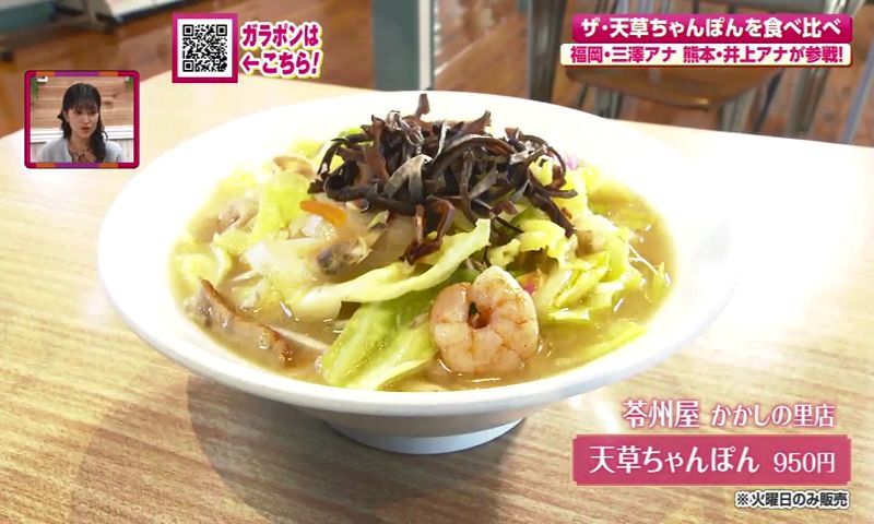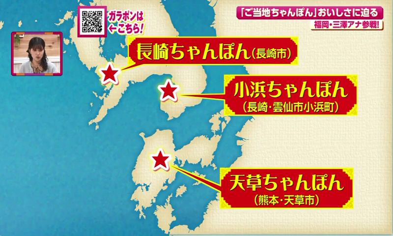 KBC九州朝日放送の三澤澄也アナウンサー、KAB熊本朝日放送の井上聖貴アナウンサーとともにNCCの羽地政義アナウンサーが、海沿いの温泉街で生まれた「小浜ちゃんぽん」と、海を越え独自の進化を遂げた「天草ちゃんぽん」を徹底解剖しました。
