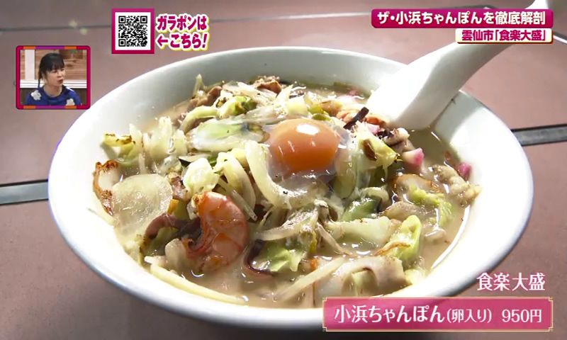 創業約60年の老舗「食楽大盛」の小浜ちゃんぽん(卵入り・950円)。殻付き海老が最大の魅力。かつて漁師町に囲まれた小浜では、鮮度を重視し、獲れたての海老を殻付きのまま使った伝統を守っています。殻付き海老を最初に炒めて、旨味を引き出したスープ。噛めば、焼きのカリカリ感とともに、香ばしさとまろやかさが一気に広がります。後乗せの生卵は、半熟で食べても、スープに溶かしても絶品です。