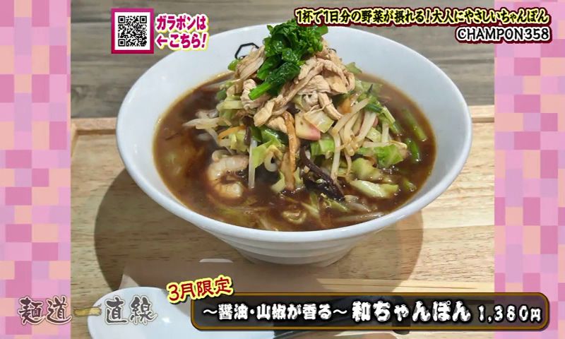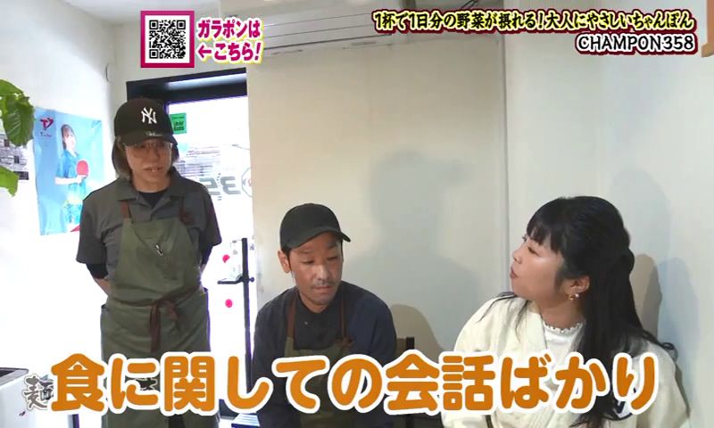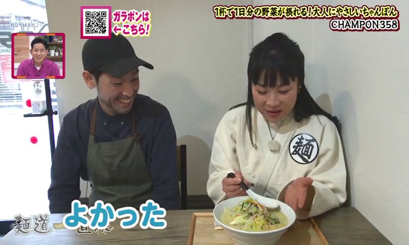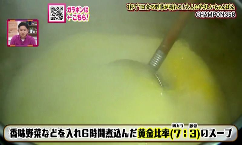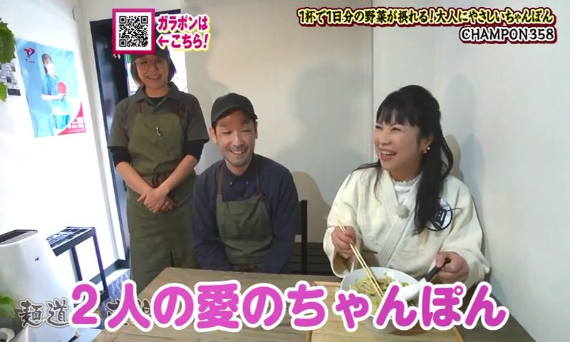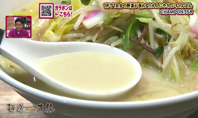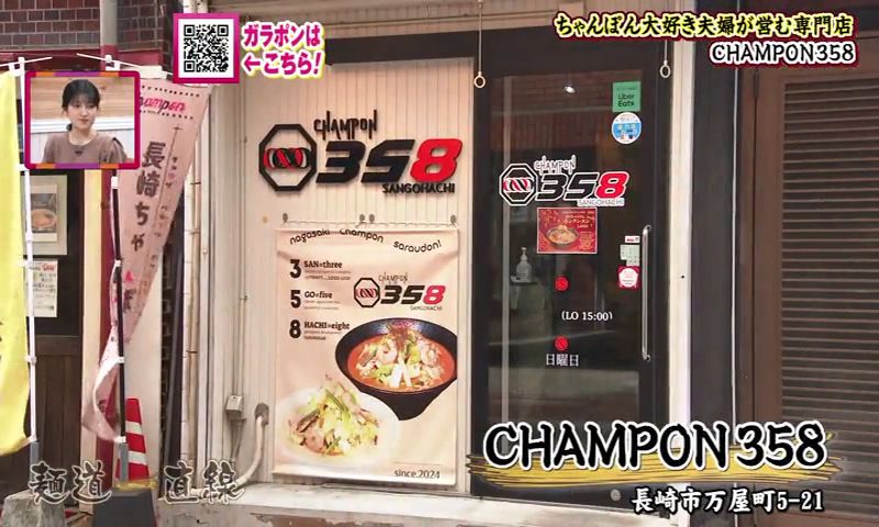 そんな伊藤さんには和食の知識を活かして、ずっと温めてきたメニューがありました。 今年から仕掛けたという新名物が、「鯨のさえずりうどん」(1,380円)です。 長崎の人には馴染みのあるくじらの部位のひとつ「さえずり(舌)」をつかっています。 くじらの上品な出汁が出ています。 香りもよく、くじらの脂身がとてもまろやかです。 基本の出汁は、昆布に煮干し、そして4種の鰹節からとっています。 さえずりの白い部分は、ぶるんぶるんです。 凍った生のくじらをスライスして、直炊きしています。 伊藤さんは、「この上品な出汁は、さえずりにしか出せない」と惚れ込んでいます。 麺は、香川県産の小麦100%です。 ハリがあり、のどごしがよく、もちもちしています。 伊藤さんの実家は、ちゃんぽん屋さん。でも「鯨のさえずりうどん」には、「打倒!長崎ちゃんぽん」の思いを込めています。 「鯨のさえずりうどん、食べに来てください」 うどんと酒 甚八 聞き込みで、聞いた「CHAMPON358」、野菜がたっぷりと評判の店だそうです。 閉まっていたので、しばし待つことに... 店主の廣瀬雄大さんが夫婦で営んでいます。突然のお願いにもかかわらずOKをいただきました。 今年の7月で開店から2年を迎えます。 店名の「358」は、風水から取っています。 数字ひとつひとつに、「繁盛」、「繁栄」という意味があるそうです。 また、数字を店名にすることで外国の人も覚えやすいという狙いもありました。 ちゃんぽんだけのためにスープをとって、新鮮な野菜をつかいます。 看板商品は、店の名前を冠した「358野菜盛ちゃんぽん」(1,100円)。1日に必要な野菜の摂取量350グラムを摂ることができます。 キャベツ・玉ねぎ・にんじん・もやしなど野菜は およそ8種類。 一杯のちゃんぽんにこれだけの野菜が使っています。 脂っこくなく、あっさりと食べられるちゃんぽんを目指しています。 「健康になってほしいというのがあって」 確かに野菜たっぷりです。計ってみると、362グラムの野菜が使われていました。香味野菜と「鶏ガラ7、豚骨3」の廣瀬さんの黄金比でとった自慢のスープ。鶏の味、豚骨の味、なおかつ野菜の甘みを感じることができます。 野菜たっぷりで、麺が見えないほどです。 麺は、ちょっとふとめで。平らな麺。表面がなめらかで、するっと入っていきます。香りがよくて、コシがある麺です。そしていい感じにスープを吸っています。 「野菜がシャキシャキ、野菜の甘みもスープに出ているのを感じる」 奥さんの恵さんは、栄養士で、2人の会話は自ずと食に関する話題ばかりになります。 「ちゃんぽんは、たんぱく質、炭水化物、ミネラルが摂れるので、これ一杯食べれば1日の栄養は摂れると言えるくらいのスペシャルな料理」 2人でメニューを考えることもあるそうです。 月替わりの限定メニューを出していて、3月は醤油ベースの「~醤油・山椒が香る~和ちゃんぽん」(1,380円)です。 2人は、「地元の方にも外国の人にもたくさん来ていただける店にしていきたい」、「みんなが幸せになれるお店にしたい」とちゃんぽん愛にあふれています。 CHAMPON358