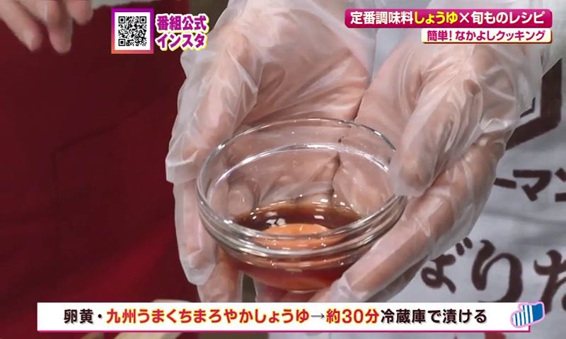 ②九州うまくち まろやかしょうゆ に30分ほど冷蔵庫で漬けこんだ卵黄をのせ、漬け汁をかける。