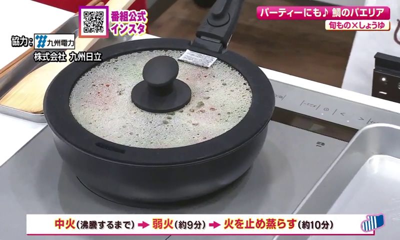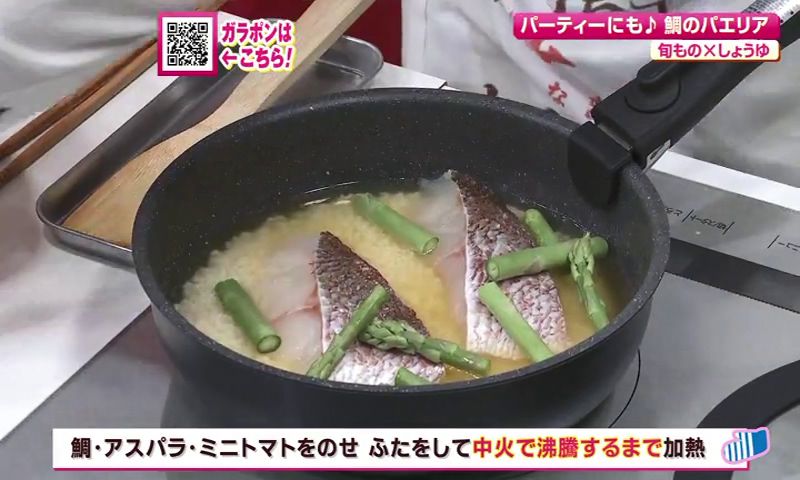 ③鯛、アスパラガス、ミニトマトをのせ、ふたをして中火で沸騰するまで加熱する。