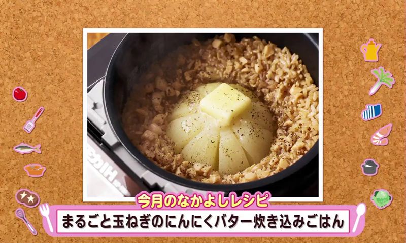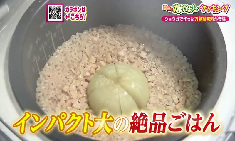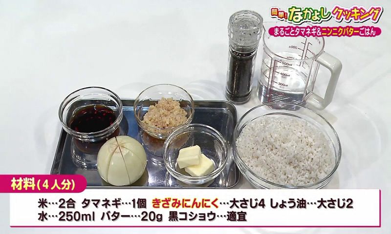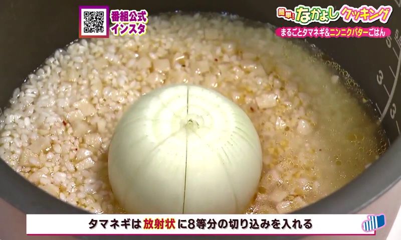 ① 研いだ米に きざみにんにく、しょう油、水を加えて軽く混ぜ、放射状に8等分の切り込みを入れたタマネギを入れて炊く。