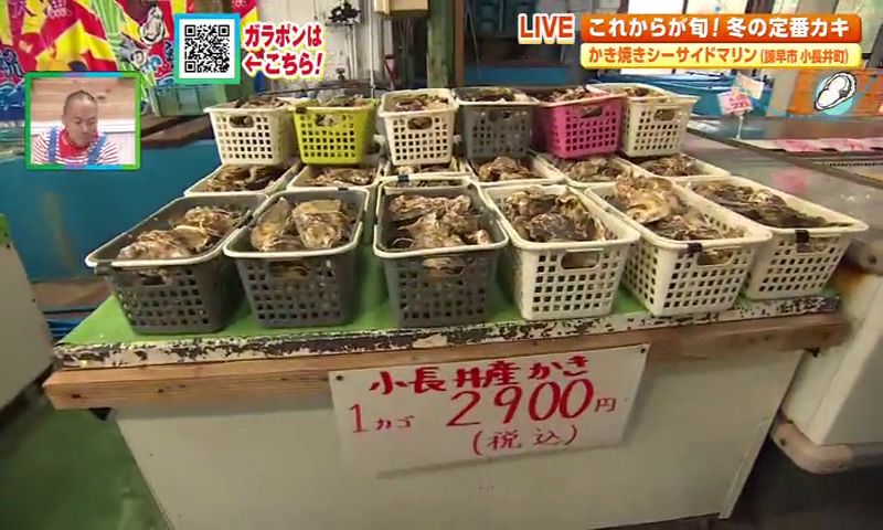 お店に入るとたくさんの生け簀が並び、小長井産の新鮮なカキやハマグリ、ヒオウギ貝、サザエなどが勢揃い。カキは1かご(約2kg・20個程度)で2,900円(税込)。ハマグリ、ヒオウギ貝、サザエは各1個400円です。