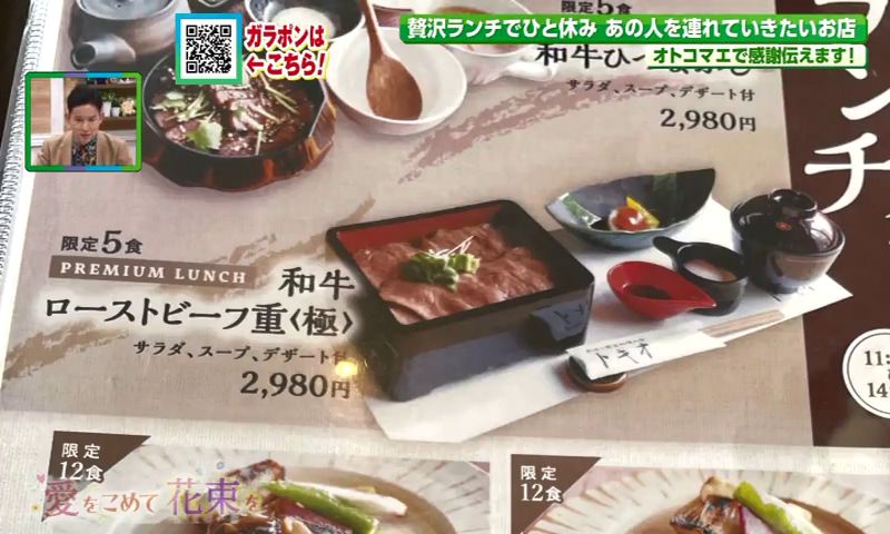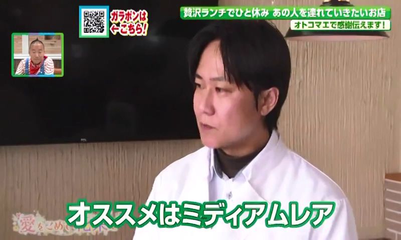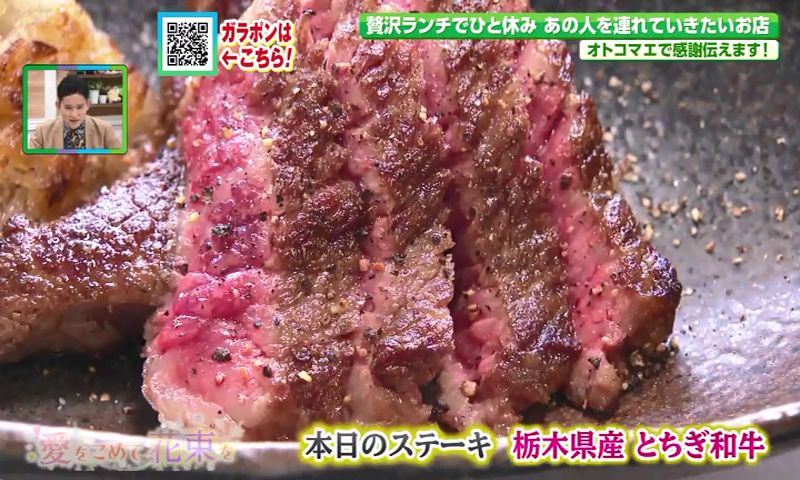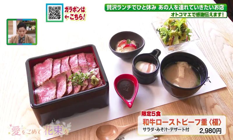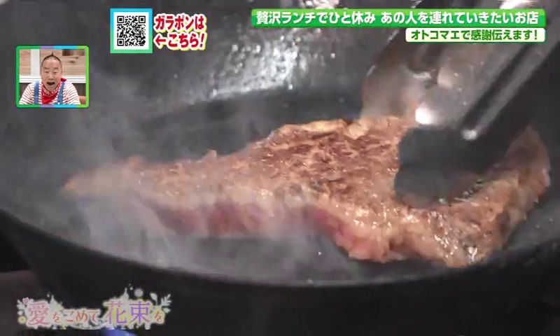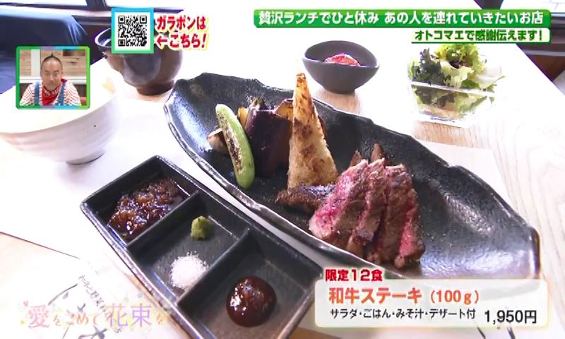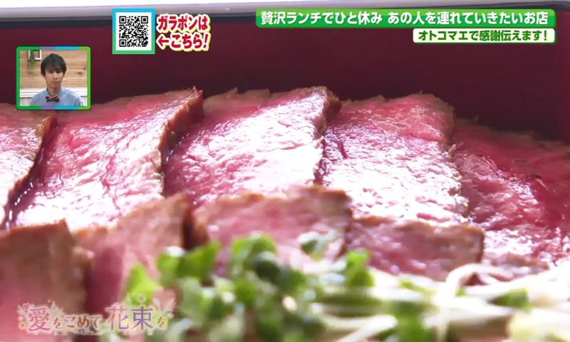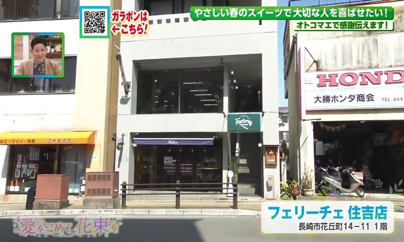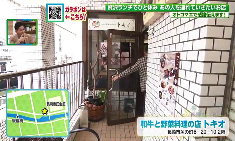 料金は、カット+シャンプー+シェービングで4,950円~ 告白前の高校生が来ることもあるそうです。 FACTORY barber shop 1月末にオープンしたばかりの「フェリーチェ」住吉店。 ファクトリー バーバーショップと同じビルの1階にあります。 フルーツを使った美しいスイーツが並びます。 奥様へのプレゼントにぴったりなケーキを見つけました。 春限定の可愛いケーキ。「さくらロール」(626円)です。 ケーキを手に次の店へ フェリーチェ 眼鏡橋の近くにある「和牛と野菜料理の店トキオ」。 羽地アナが言うには、大切な人を連れていきたくなるお店だそうです。 オーナーシェフは、長崎の老舗料亭などで修業し、和食を20年近く勉強した太田黒 敬さん。 和食と和牛、そして新しい料理を提供したいとオープンした店です。 ランチは、すべて提供数に限りがある「限定メニュー」です。 野菜はじっくり時間をかけて蒸して、焼き目をつけ、 ステーキも同じタイミングで焼き上げます。 「和牛ステーキ・100グラム(サラダ・ごはん・味噌汁・デザート付き)」(1,950円)は、限定12食。 この日のステーキは、栃木県産とちぎ牛。 トキオでは、日替わりで全国の和牛が食べられるんです。 薬味は3種類。大根おろしの和風だれ、ワサビと岩塩、ニンニク味噌です。 大田黒さんのおすすめは、ミディアムレアですが、お好みに合わせて焼いてくれます。 「和牛ローストビーフ重〈極〉(サラダ・味噌汁・デザート付き)」(2,980円)は、限定5食。 部位も希少なもので、長崎和牛の中でも肉質がしっとりとした雌牛のイチボを使っています。 表面をカリっと、中をじゅわっと仕上げるなど、食材の美味しさが、最大限発揮できるように調理法にこだわっているそうです。 窓から眼鏡橋が見えるすてきなロケーションです。 和牛と野菜料理の店トキオ 感謝を伝えるなら花束。2人は、「男性客が多い」と評判の花屋さんにやってきました。 長崎市新戸町の「BULL FLOWER」。 両親がしていた花屋さんを引き継いだ松本将平さんの店です。 会社帰りの人など男性客が多いそうです。 喜ばれる花束にするポイントは、まず「贈る相手の好きな花や色を伝える」こと。 そして「贈る相手のイメージを伝える」とより作りやすいそうです。 選びやすいように色で分けています。 染色液を吸い込ませ、花びらを染めた花も人気だそうです。 羽地アナは、奥さんの好みに合わせてブルー系をリクエスト。 ちんねんさんは、黄色をリクエスト。 2人のリクエストをもとに松本さんが花束を作ってくれました。 羽地アナと ちんねんさん それぞれが、奥さん、そして家族に「ありがとう」を伝えました。 BULL FLOWER