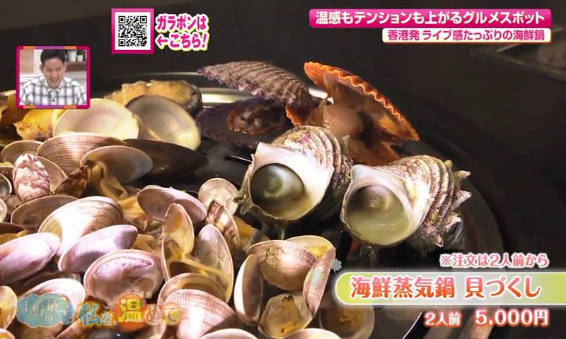 「海鮮蒸気鍋貝づくし」(2人前5,000円)は2名から注文可能。このほか、貝の旨みを存分に味わい、お粥まで楽しめる贅沢なセットも人気です。