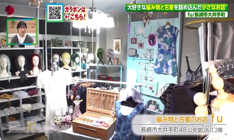 長崎市大井手町の電車通り沿い、公会堂ロジックビルの端っこにまるで秘密基地のような小さな入口。細い階段を上がると、4坪ほどのこぢんまりとした空間に広がるのは、編み物と古着のお店「fu(ふう)」です。2025年11月1日にオープンしたばかりの新しいお店です。