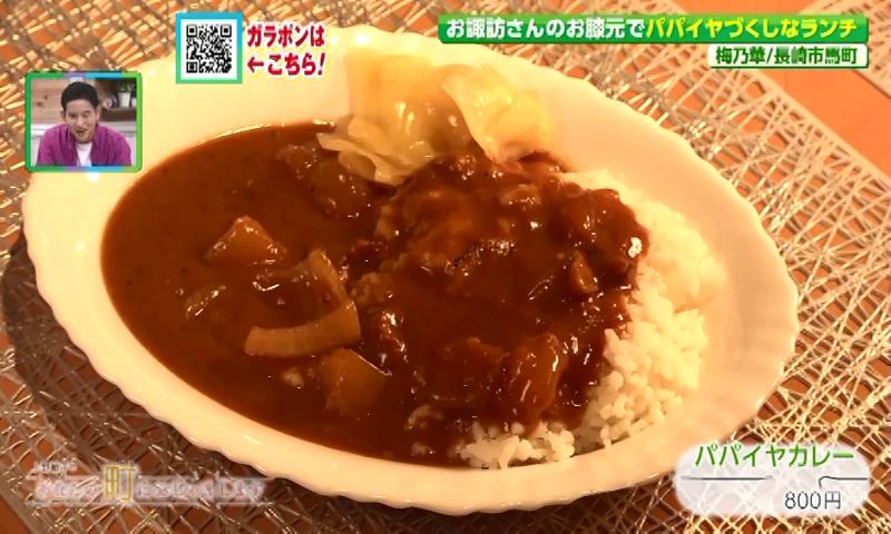 看板メニューの「パパイヤカレー」(800円)は、じゃがいものようにゴロッと入ったパパイヤが特徴。とろみのあるカレーに溶けかけたパパイヤがよく合い、クセのないやさしい味わいです。ダイエットにも効果があったというヨシ子さんイチ推しの一品。