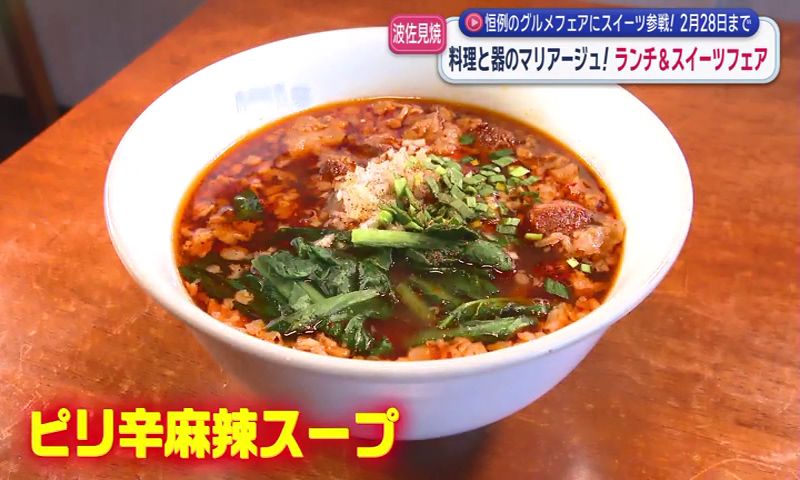 青みがかった白い波佐見焼のどんぶりに、ピリ辛の麻辣スープと地元産小松菜の緑が鮮やかに映え、山椒の香りが食欲をそそります。