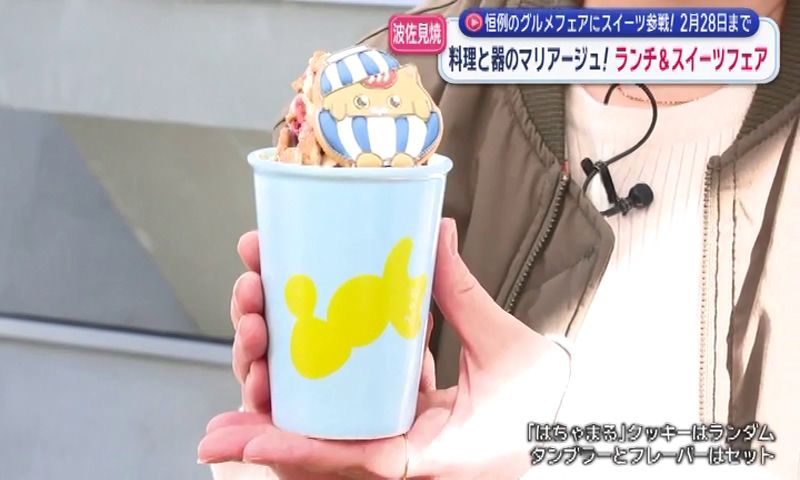 ロゴ入り陶器タンブラーに町の公式キャラクター「はちゃまる」のアイシングクッキーをトッピングした冷たいフラッペや温かいラテ(タンブラー付きフラッペ1,650円、ホットラテ1,550円)を提供。