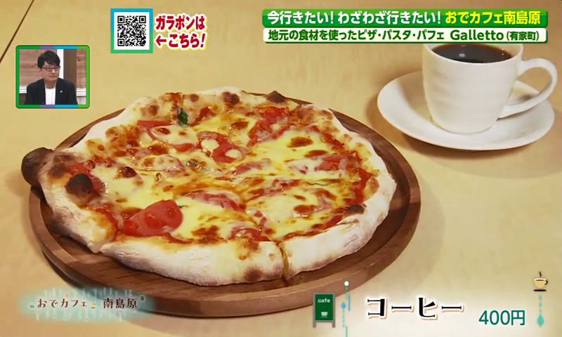 おすすめは、南有馬産のトマトをたっぷり使った「トマトピザ・Sサイズ」(1,200円)。生地を丁寧に作り、ジューシーなトマトを贅沢にのせて窯で焼き上げます。ガレット通は、焼きたてピザに「コーヒー」(400円)を合わせて楽しむのが定番です。
