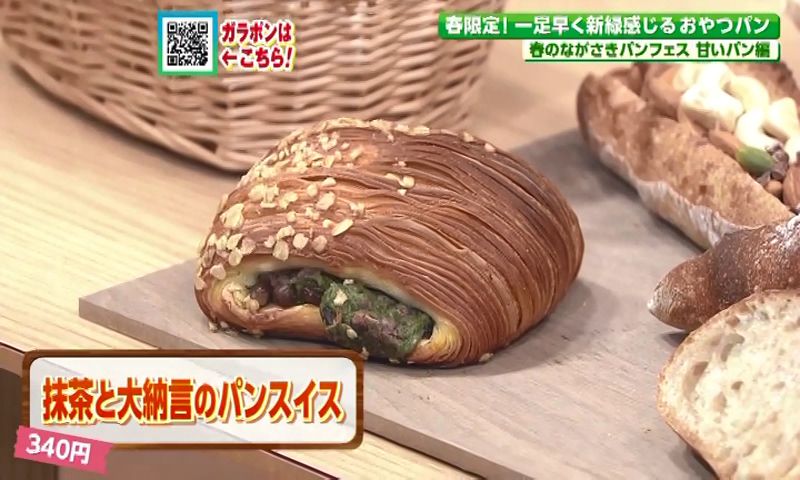 店内には常時約70種類ものパンが並び、訪れるたびに新しい味と出合えるのが魅力。春限定のおすすめは「抹茶と大納言のパンスイス」(340円)。サクサクのクロワッサン生地で、東彼杵産の抹茶とあんこを包み込んだ一品です。新緑の季節にぴったりの鮮やかな色合いと、春の芽吹きをイメージした優しい味わいが人気です。小麦粉は北海道生まれ九州育ちの小麦を使用し、風味豊かに焼き上げています。