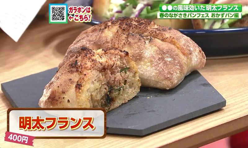 おすすめは、おかずパンの王道「明太フランス」(400円)。博多の明太子をマヨネーズやしょうゆと合わせた自家製フィリングは、プチプチ感と明太子本来の旨みが際立つ逸品。隠し味に岩海苔を加え、ふわっと広がる磯の香りが明太子の美味しさをさらに引き立てます。