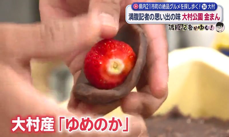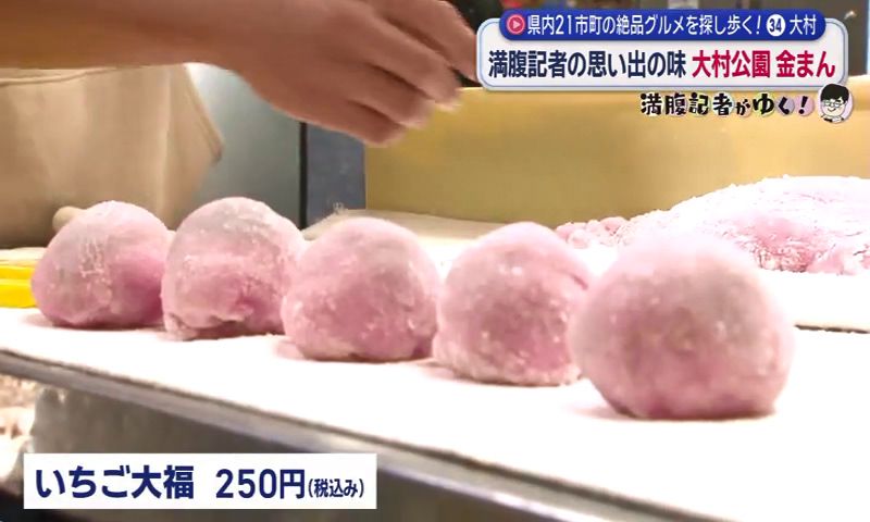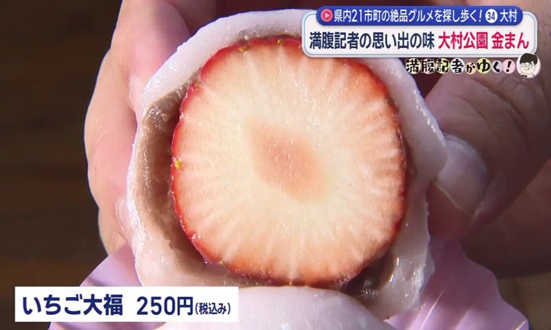まとめて10個買って帰る人もいるという人気商品。満腹記者もあるだけ全部買っていたという思い出話をしながら、手には大村産「ゆめのか」を使った「いちご大福」(250円)。みずみずしい果実感が楽しめる、期間限定商品です。