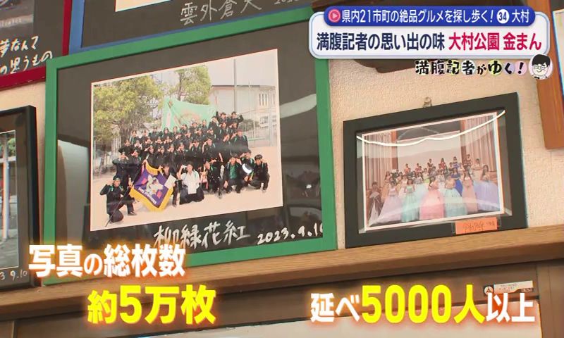 金子饅頭のもう一つの名物は、壁一面に貼られた高校生や常連客たちの写真。これまでに撮影した写真は延べ5,000人以上、新しく撮影したら古い写真はアルバムに。こうして増えたアルバムは37冊、枚数にして5万枚以上あります。37冊目のアルバムには、卒業生が彼氏や家族を連れて戻ってきた記念の一枚もありました。