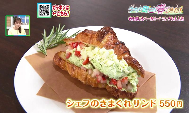 もうひとつのおすすめは、クロワッサンを使った「シェフの気まぐれサンド」(550円)。取材日は、発酵バター香るクロワッサンに、いちごと抹茶のクリーム、ホワイトチョコをトッピングした春らしいサンドが登場。時季ごとに内容が変わるので、訪れるたびに新しい味に出会えます。