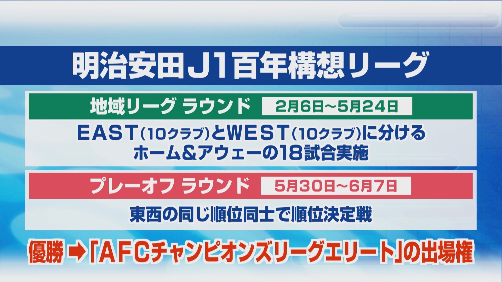 J1の20クラブを東のイースト・西のウエスト、それぞれ10クラブに分け、地域リーグラウンドとしてホーム&アウェーの18試合を行います。その後、東西の同じ順位同士で順位決定戦を実施。首位同士の対戦で優勝すれば、アジアのクラブ最高峰の大会、「AFCチャンピオンズ・エリート」の出場権が与えられます。