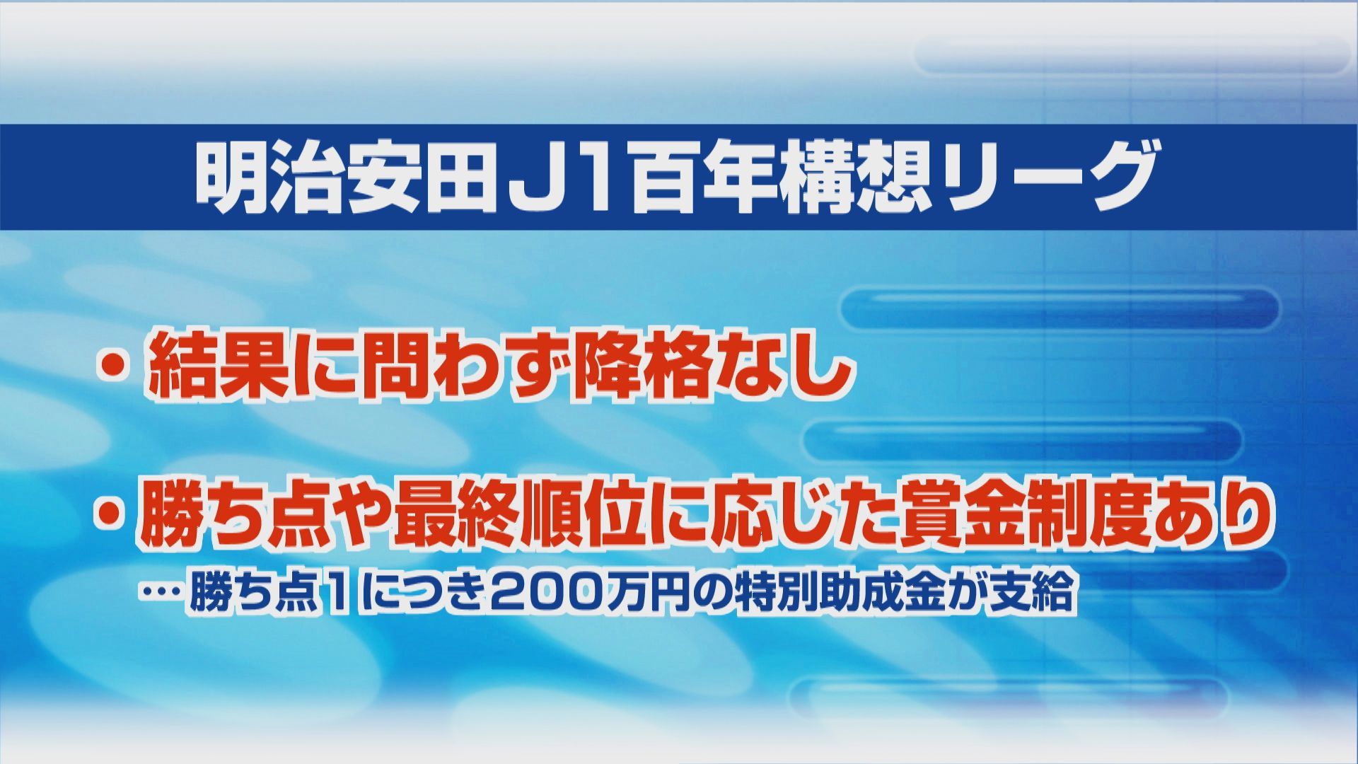 また百年構想リーグでは、降格はありません。勝ち点や最終順位に応じた賞金制度もあり、勝ち点1につき200万円の特別助成金が支給されます。