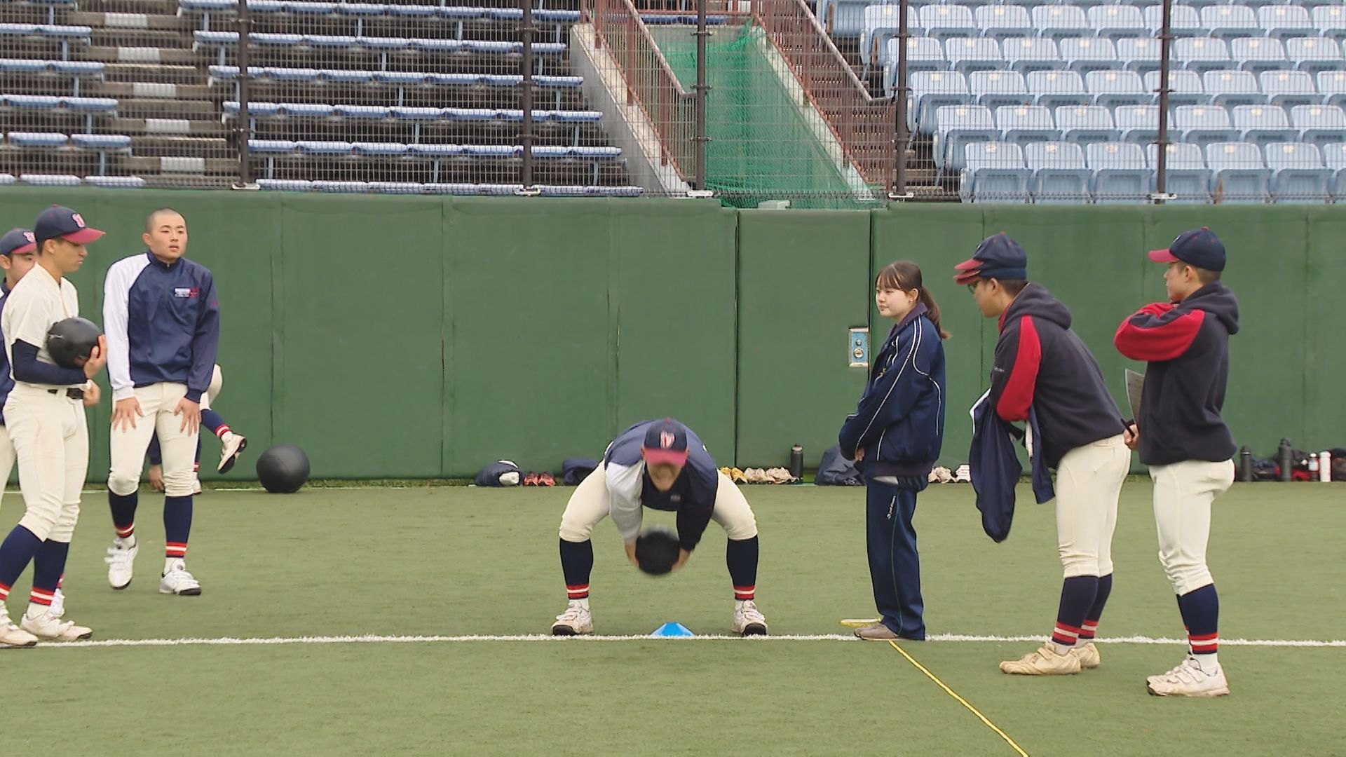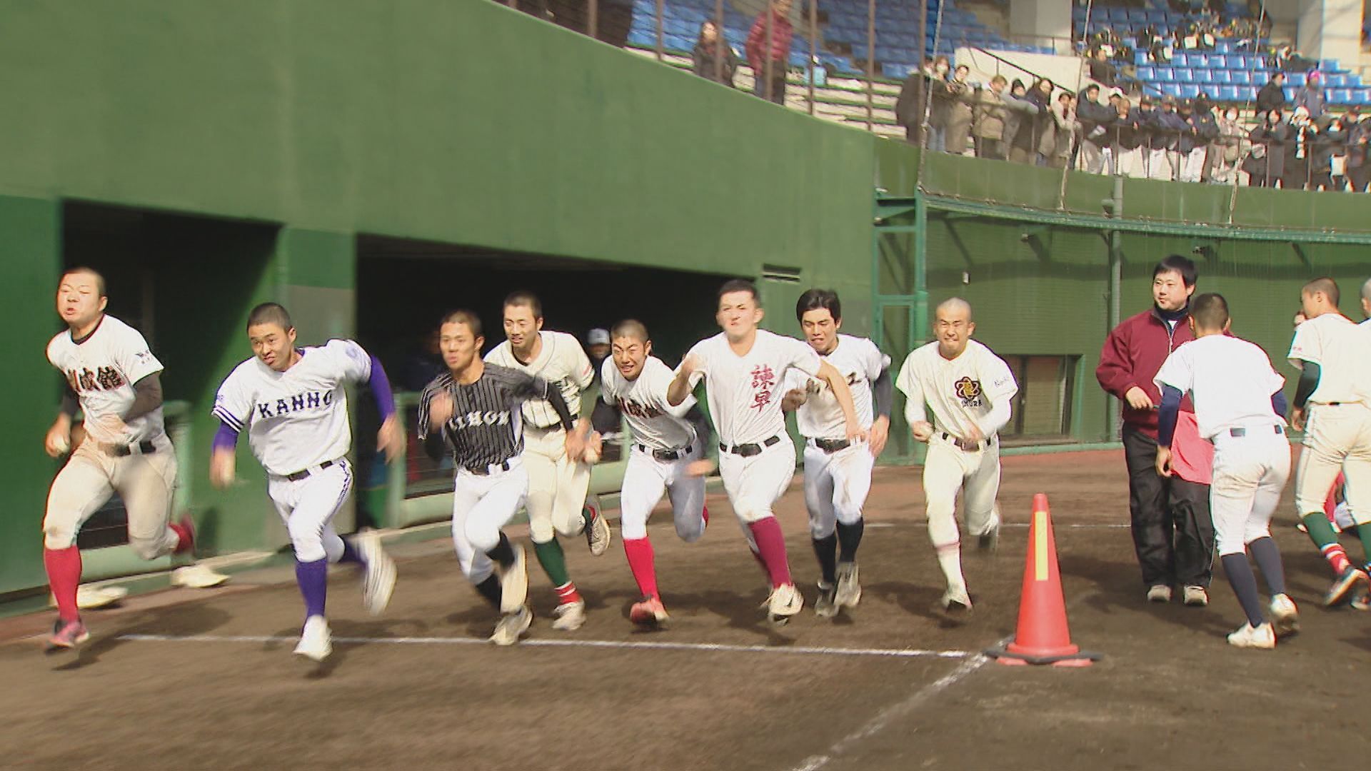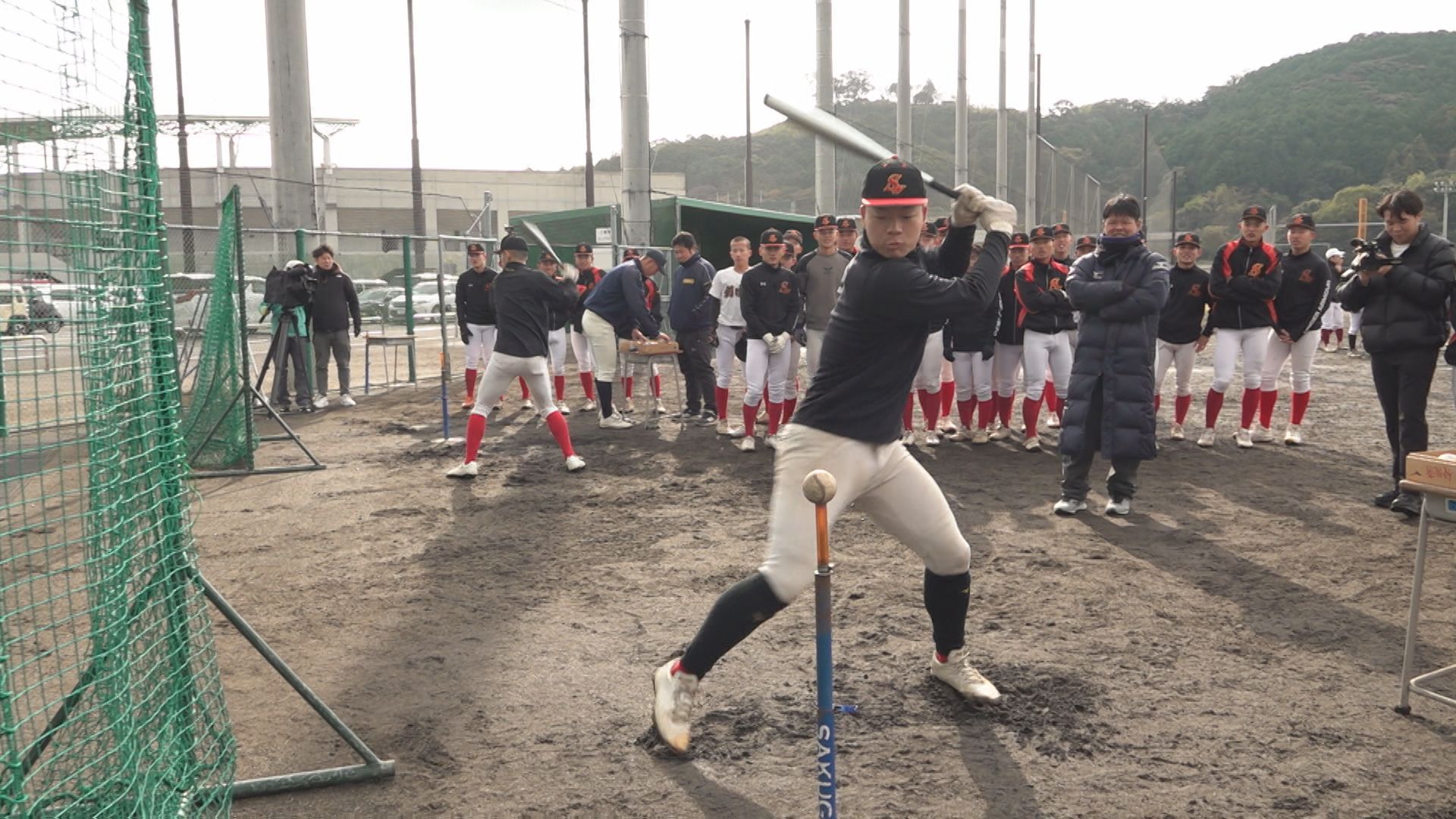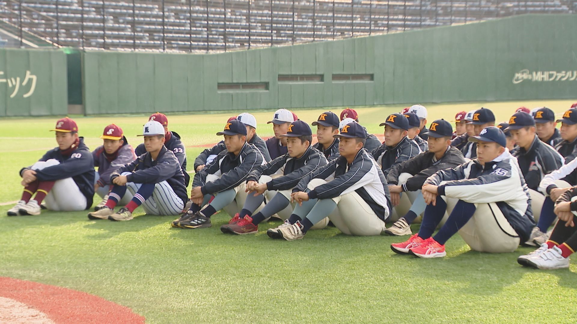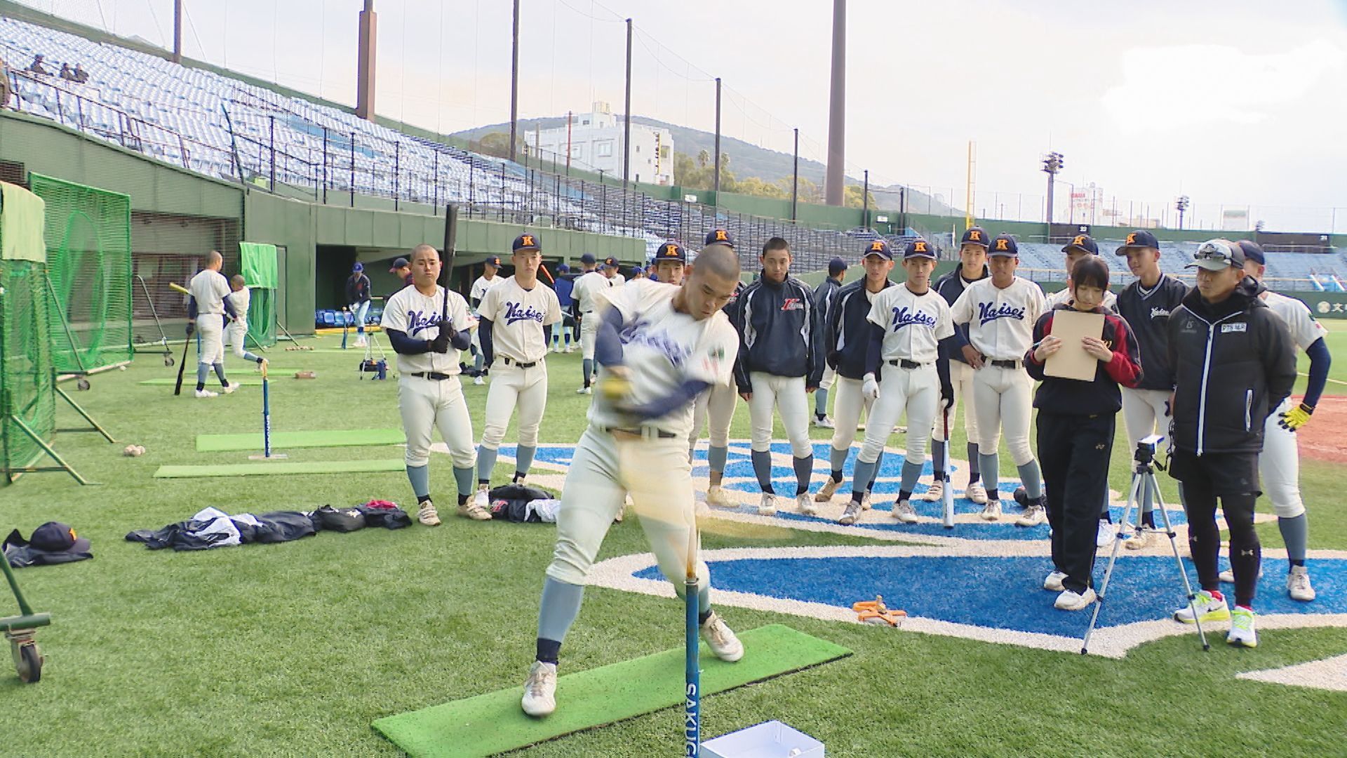 長崎市、諫早市、佐世保市の3会場で同時に行われた「第1回長崎県高校野球部対抗競技大会」には、県内から37校から約800人が参加しました。個人やチームとしての身体能力を知り、シーズンオフでの基礎体力の増強や技術向上につなげようと、県高野連が初めて開きました。 長崎市の県営野球場では、長崎地区の11校約250人が参加。個人種目では、100メートル走、立ち三段跳び、塁間走、打球速度、メディシンボール投げの5種目を競いました。 春のセンバツ甲子園「21世紀枠」の九州地区推薦校に選ばれている長崎西のメンバーも気合十分で臨みました。 長崎西2年桑原直太郎主将:「本当に自分たち(推薦校に)選んでいただいたことに光栄に思いますし、選抜はまだ全然決まっていないんで、ここから選抜に向けた練習となっていくんですけど、もし出られなかったとしても、春の大会もすぐあるので、そこに向けてもっともっとレベルアップしていきたいな」 100m走では、海星2年の小川悠人選手が11秒88で長崎地区1位。 Tバッティングで打球の速さを測る打球速度では、同じ海星2年の小川幹裕選手が147kmを記録。長崎地区1位、全体で5位となりました。 一方、中地区では、15校から約360人が参加しました。 去年秋の九州大会で過去最高成績に並ぶ準優勝を果たした長崎日大。脚力を競う立ち三段跳びでは、ショートを守るキャプテン・梶山が7m06をマーク。チームトップの記録かと思われましたが正捕手の太田が、さらに大ジャンプで7m80。 身長165センチと小柄ながら、さすが長崎日大のリードオフマン。強靭な脚力を見せました。 続いて、100m走。自身のタイミングでスタートし、センサーで自動計測されます。俊足を見せたのが鎮西学院。2年生投手の山﨑敢太選手が、11秒37で中地区1位。県内でも最速タイムとなりました。 打球速度では、創成館1年の山本大勢選手がパワフルなスイングで148kmをマークし、中地区1位・県内3位タイでした。 個人種目の順位を合算した個人総合では、長崎南山2年の高尾竣選手がトップに輝きました。団体種目の塁間継投では、ボール回しの速さを競い、夏の長崎大会3連覇中の創成館の鉄壁の内野陣が県内1位。 そして最後は、9人で200mずつバトンをつなぐ、1800mリレー。序盤、リードを奪ったのは創成館。しかし、秋の大会で何度も逆転勝利を挙げた「逆転の日大」がここでも。長崎日大がトップでゴールし、県内でも最速のタイムでした。 個人上位9人と団体種目を合わせた団体総合は、海星が1位に輝きました。
