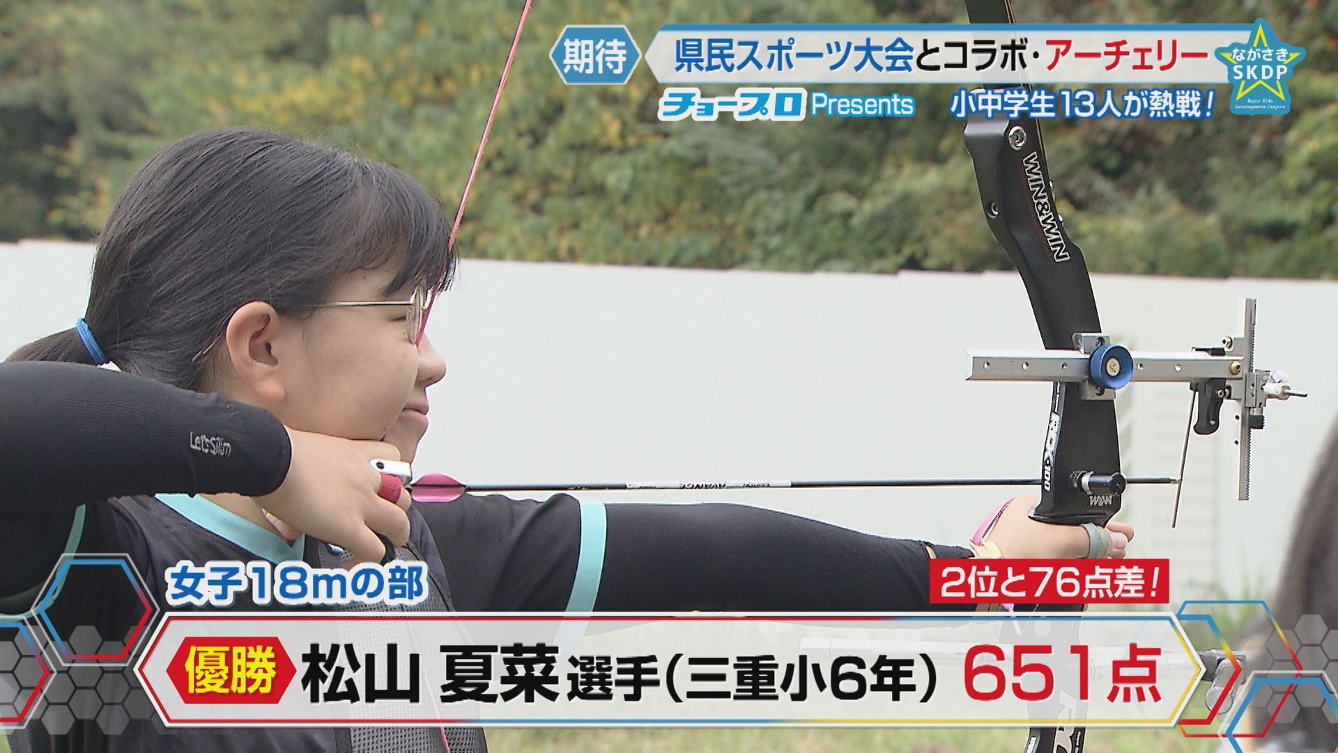 大村市で開かれた県民スポーツ大会のアーチェリー、ながさきスーパーキッズ部門には、小学4年生から中学1年生までの13人が出場しました。
