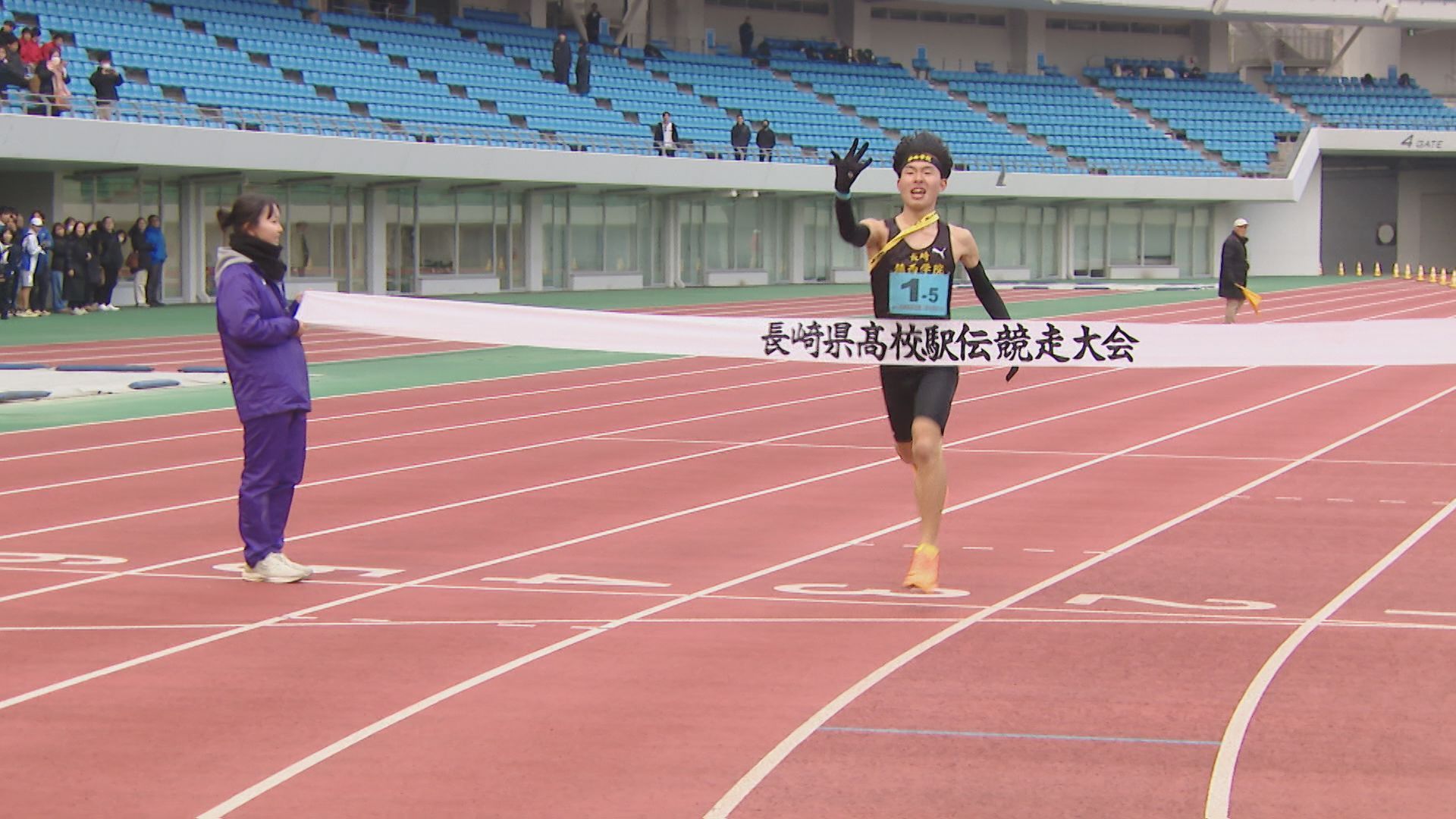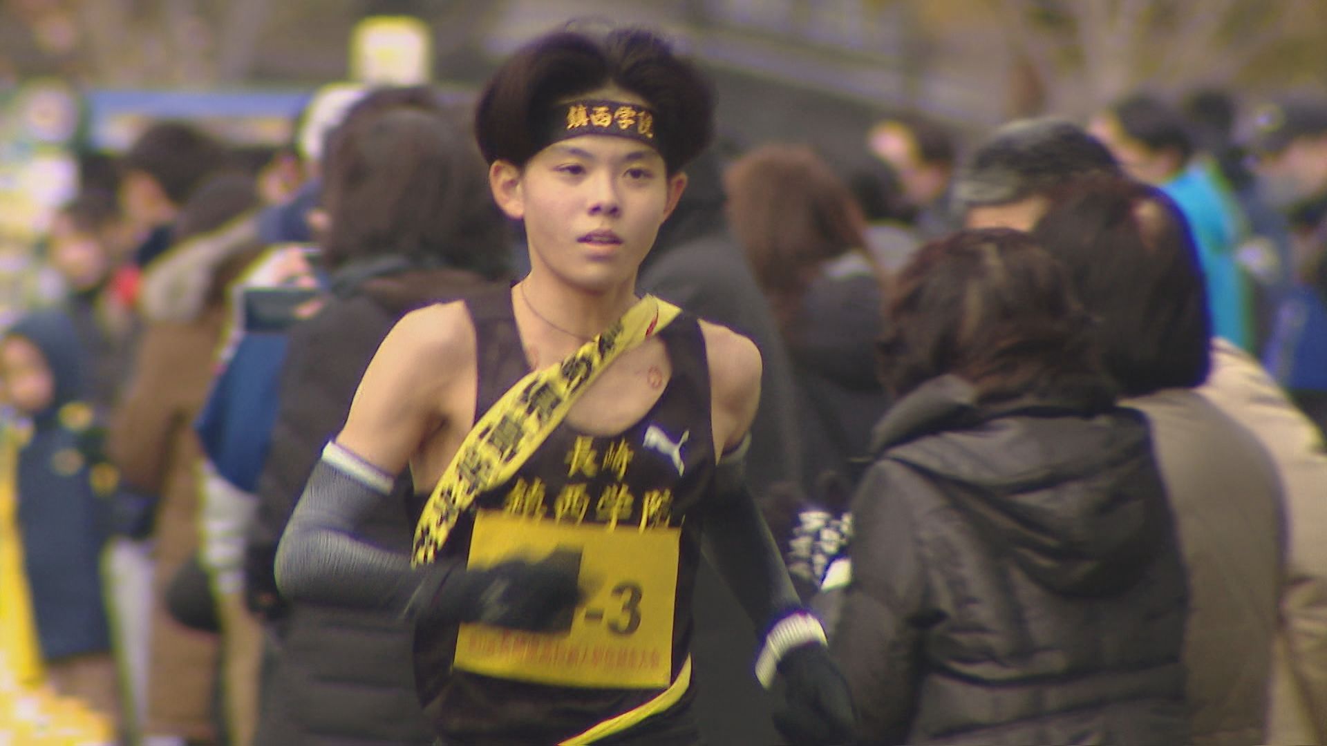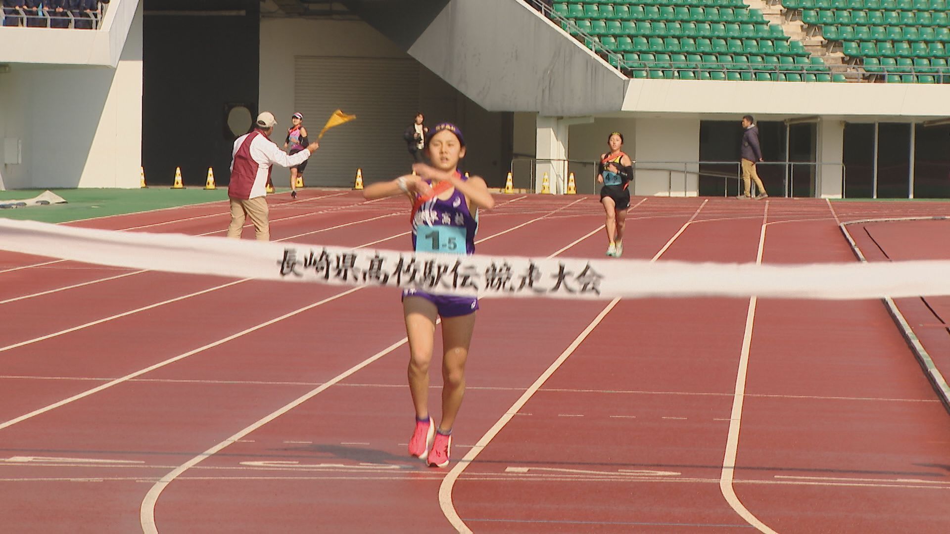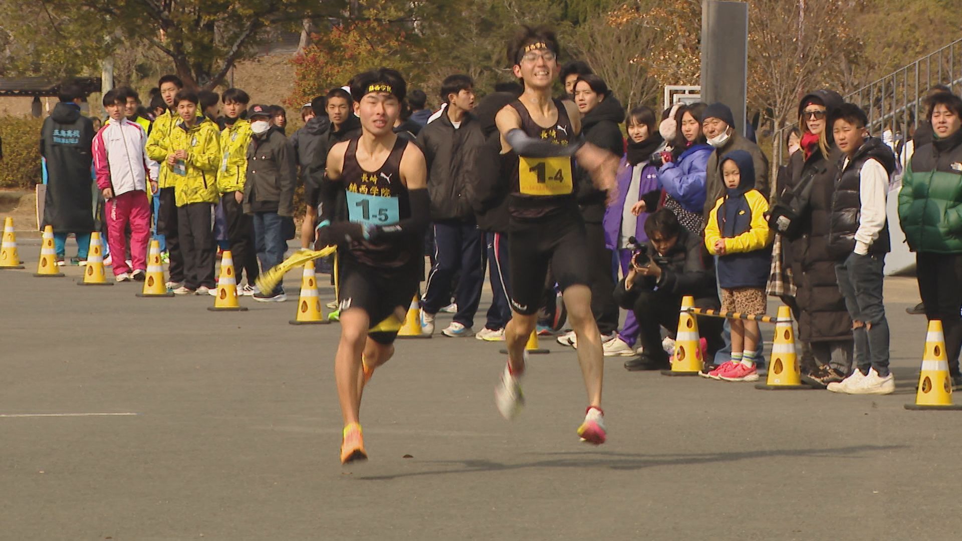 3キロの1区。去年、都大路に出場した諫早は1年生ながらアンカーを務めた中村が、先頭でレースを展開します。中継所に先頭でやって来たのは、長崎日大の安永。6連覇中の諫早に先行して、たすきをつなぎます。諫早の中村は3秒差の2位です。 2区から3区は、長崎日大が諫早にわずかにリードして中継。 3区、4区と先頭が入れ替わるなど、デッドヒートの中、鎮西学院も追い上げてきます。5区・3キロのアンカーへ。3チームが8秒以内にひしめき、3校どこが勝ってもおかしくない展開に。 1位でトラックに帰ってきたのは…王者・諫早。2年生の吉田が落ち着いたレース運びで後続を振り切り、トップでゴールし、7連覇達成。 続いて、追い上げた鎮西学院が10秒差の2位。長崎日大は、惜しくも3位となりました。 一方、26校が出場した男子は、1区間減り、5区間24キロで争います。 優勝を狙う長崎日大は1区でエース・俵が区間賞を獲得。3連覇中の鎮西学院・濵が3秒差で続きます。 2区では、長崎日大、鎮西学院、ほぼ同時で中継。 そして、最長区間8キロの3区。鎮西学院の百田が、圧倒的な走りを見せます。去年の都大路では、直前の体調不良でメンバー変更となった新エース候補が、24分02秒と、長崎日大に40秒差をつける区間賞で逆転します。 4区、そしてアンカーの5区でも鎮西学院が区間賞をとり、勝負あり。