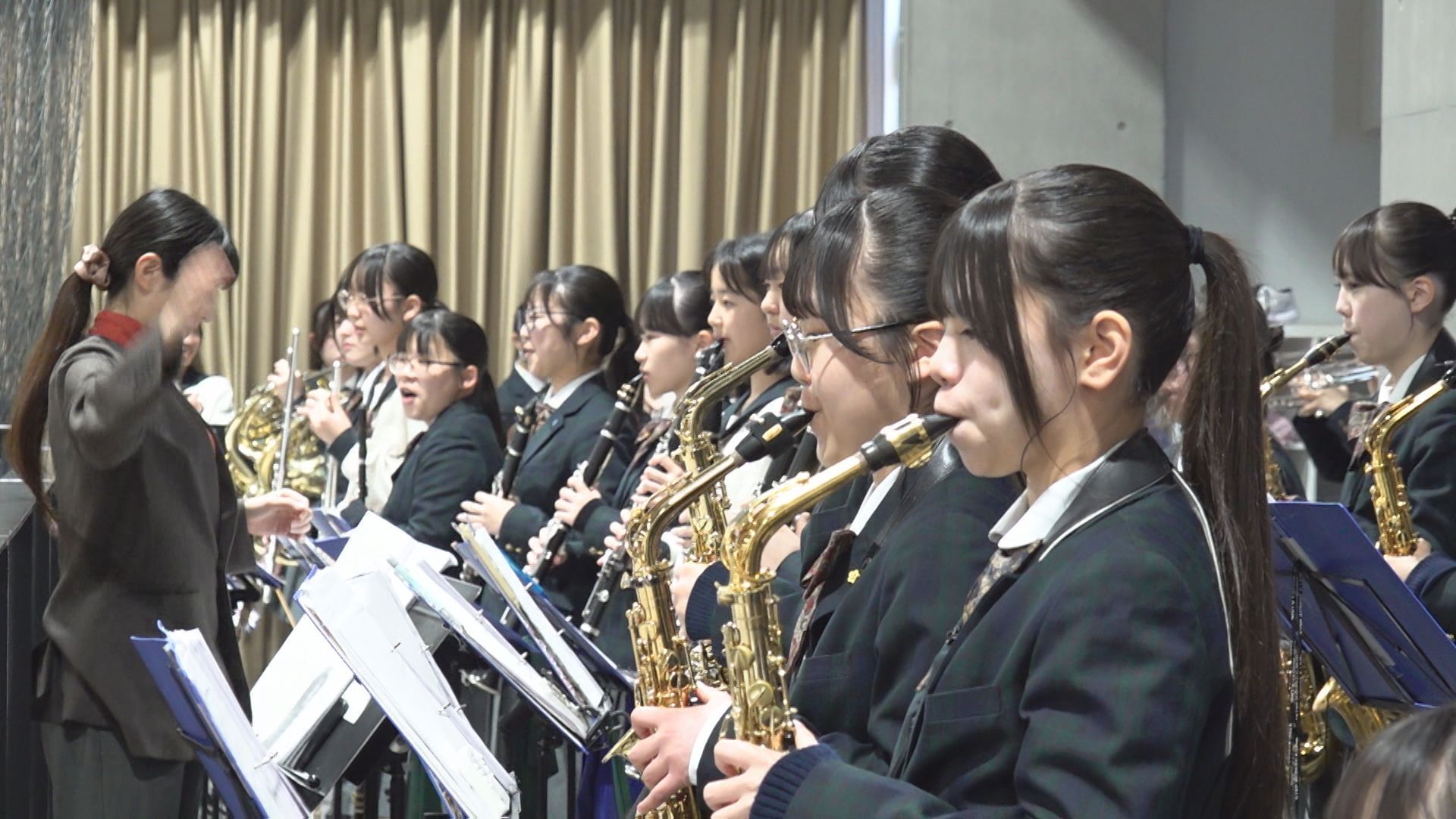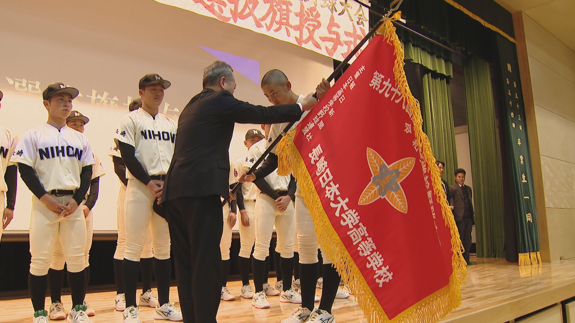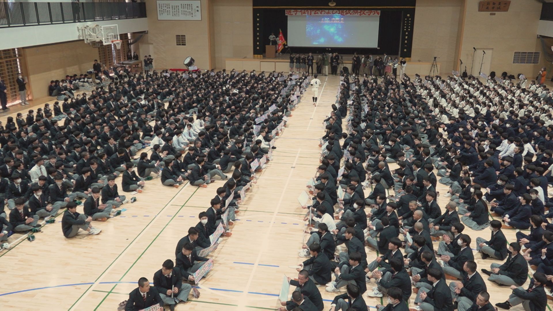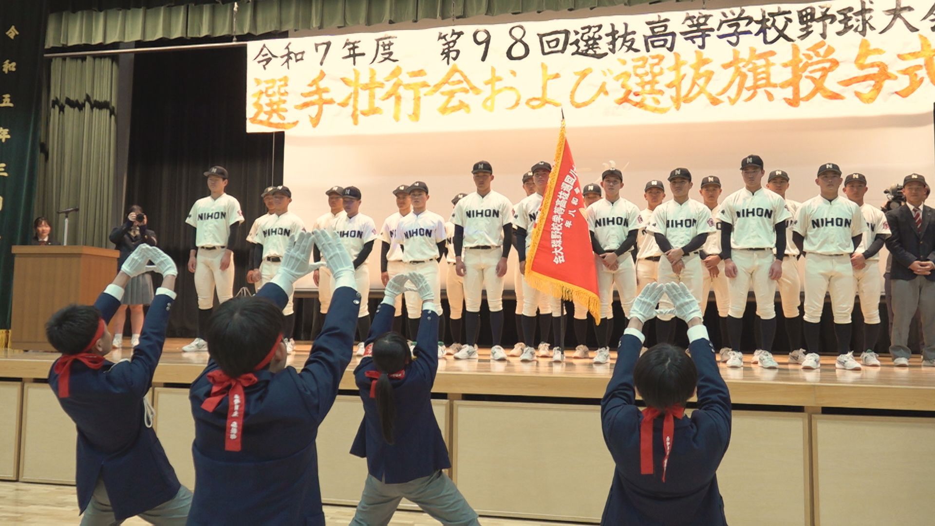 吹奏楽部の演奏とともに、3日(火)に発表されたばかりの登録メンバー20人と記録員が背番号順に1人ずつ登場。中学・高校の全校生徒約1200人が迎え、梶山風岳主将に選抜旗が手渡されました。